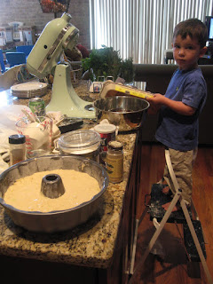 I modified the last step - I made a glaze with apple cider and powdered sugar and drizzled it over top. Jack and I were very proud of our first joint baking project. Since then, he keeps asking "bake a cake? bake a cake?" and tries to drag the stool up the counter.