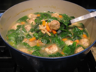 We made Ina's Italian Wedding Soup with what we had in the house. I used whole wheat dried bread crumbs and whole wheat pasta, and it was fine and a tad bit healthier: