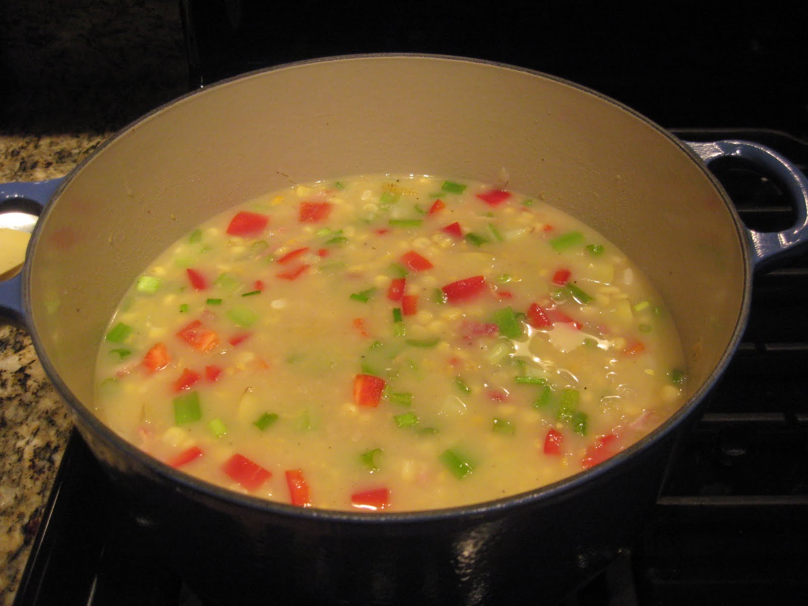 Add frozen corn, creamed corn, red pepper and green onion and cook for an additional five minutes. Add salt and pepper to taste.