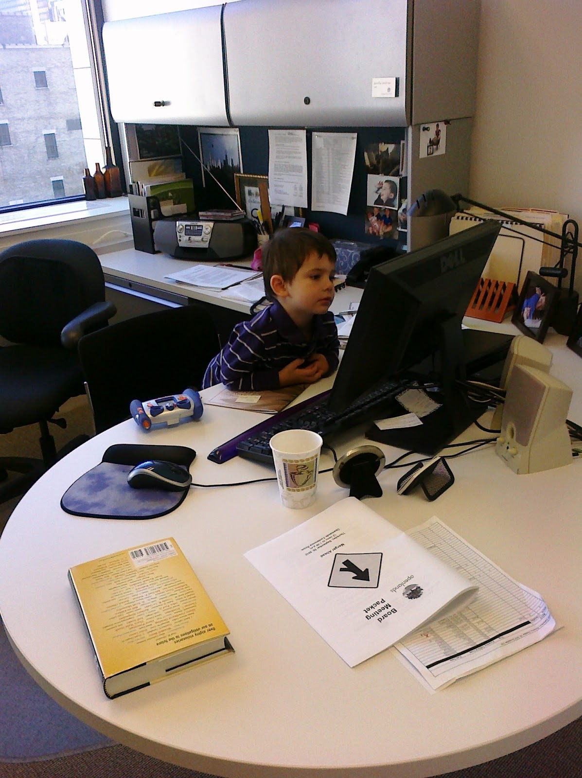 So all is well - next stop is Mommy's office on the 16th floor where Jack knows the location of every candy jar. What really makes this crazy idea feasible is that Maria the super-nanny has agreed to pick him up downtown, and my nannyshare friend Whitney has also signed off on the idea. We have some time before Maria arrives, and again, it works out well. I'm thankful for a workplace that embraces my child and even though we have a board meeting happening at noon, everyone is totally calm and cool with a toddler running amok. Jack settles in to some Sesame Street clips on my computer while I prep a few things for my meeting.