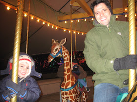 Tonight was definitely more my speed - we took Jack to see the ZooLights at Lincoln Park Zoo. My three-year-old is totally, utterly and completely in love with the holidays. He gets a magical glow when he sees Santa Claus, and we're definitely true believers. He loved the twinkling Christmas lights and pointed them out to Jeremy and me excitedly. We took a whirl on the carousel - why not? Jeremy asked me if I wanted to ride one of the animals, and I said absolutely not. If you're six and half months pregnant, and want to throw your leg up and over one of those carousel animals, be my guest. I opted to stand beside Jack to help him hold on.