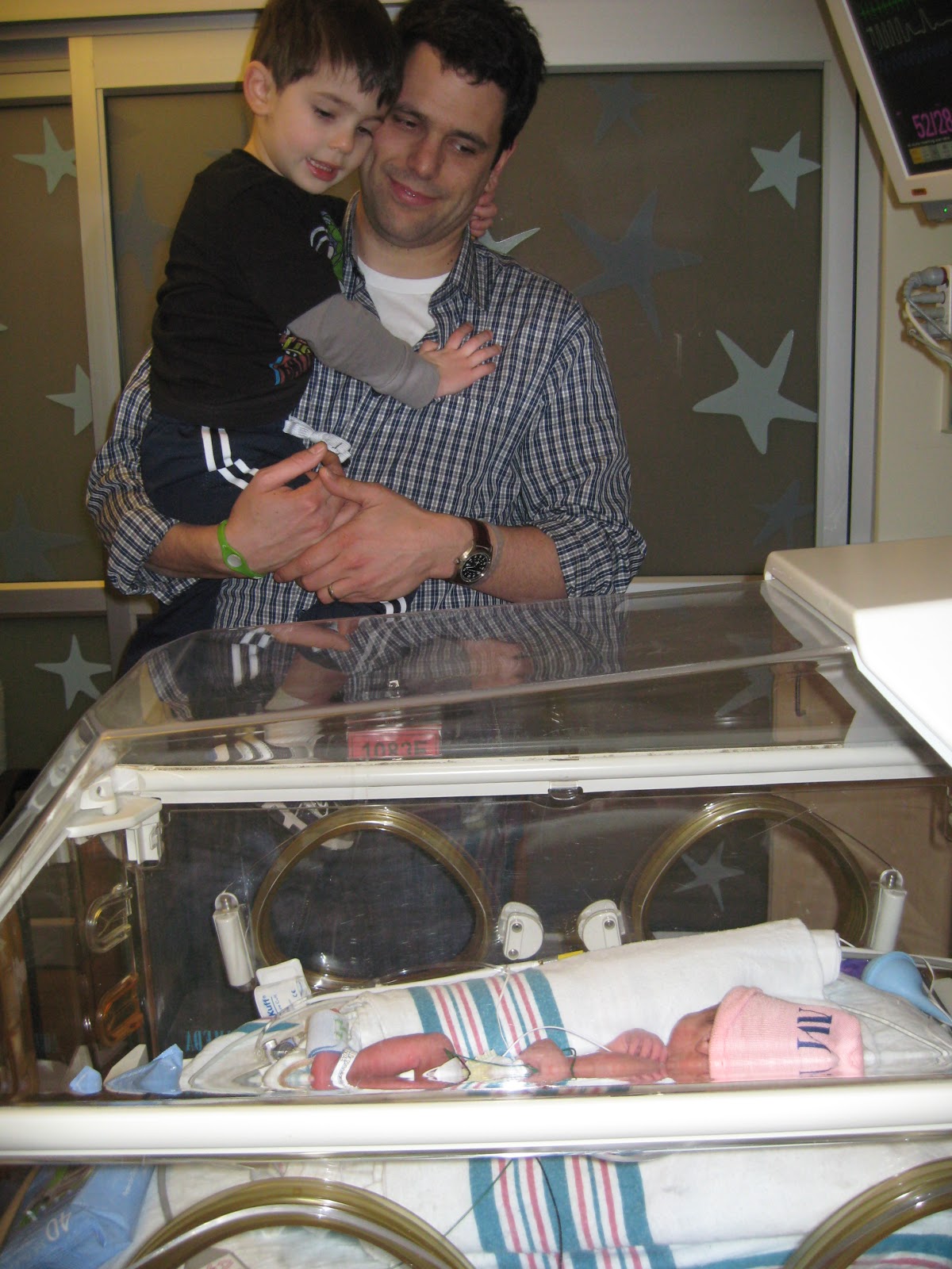 And Jossie is truly progressing - she's been gaining an ounce a day. Last night at 9 p.m., she was at 3 lb 8 oz (1590 grams). Hooray! They continue to increase her feedings. Yesterday she was taking 20 ml of breastmilk per feeding, every three hours. The doctors make their rounds in the morning daily, so we're hoping they will increase her amount again today. The magic number for Jossie is 29 ml - once she is receiving this amount per feeding, we'll lose the IV she's had since birth. The IV provides her with extra fluids that include electrolytes, lipids and sugars. This will just be one step closer to bringing our baby home.