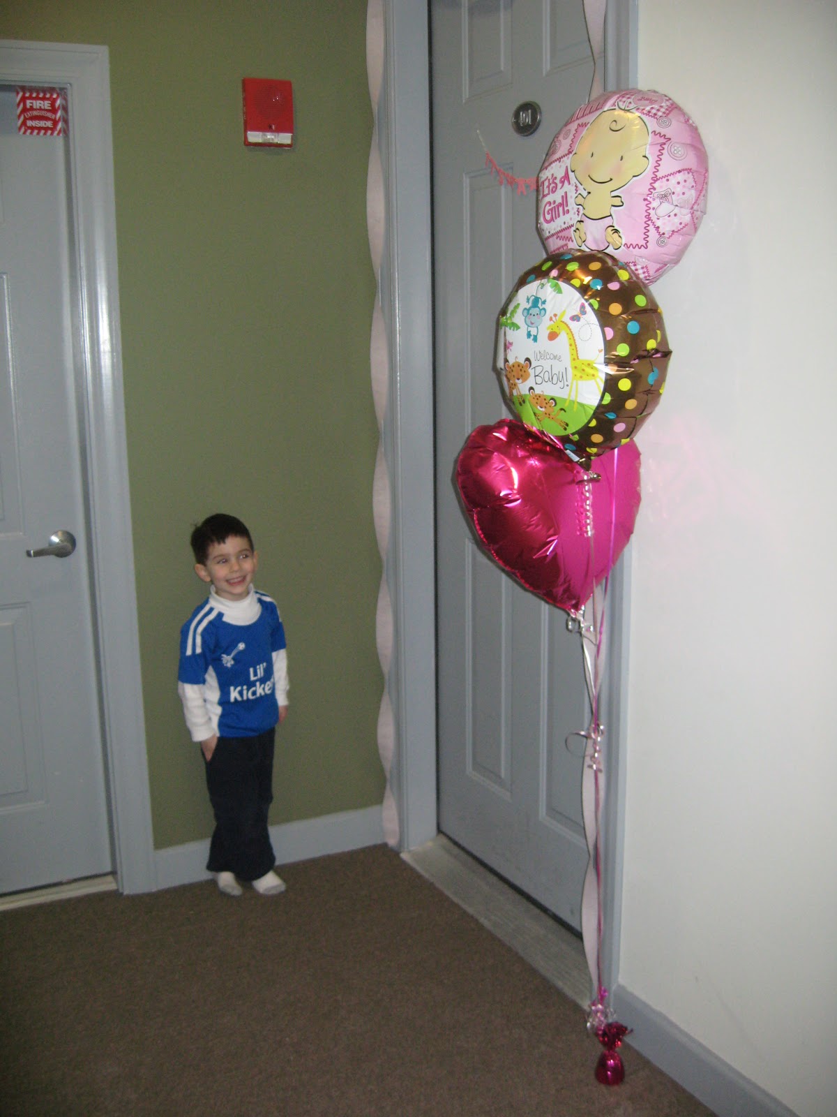 I'm typing this the morning after our first night at home. Jeremy and I are exhausted, and I have a big cup of coffee in my "Mama Bear" mug beside me. Jack's been a great big brother so far - he tells me when the baby is crying and keeps asking when she'll be big enough to play with him. (He's expecting her to join him at Pump it Up later today.) We had decorated our door late last week; here's Jack with his handiwork: