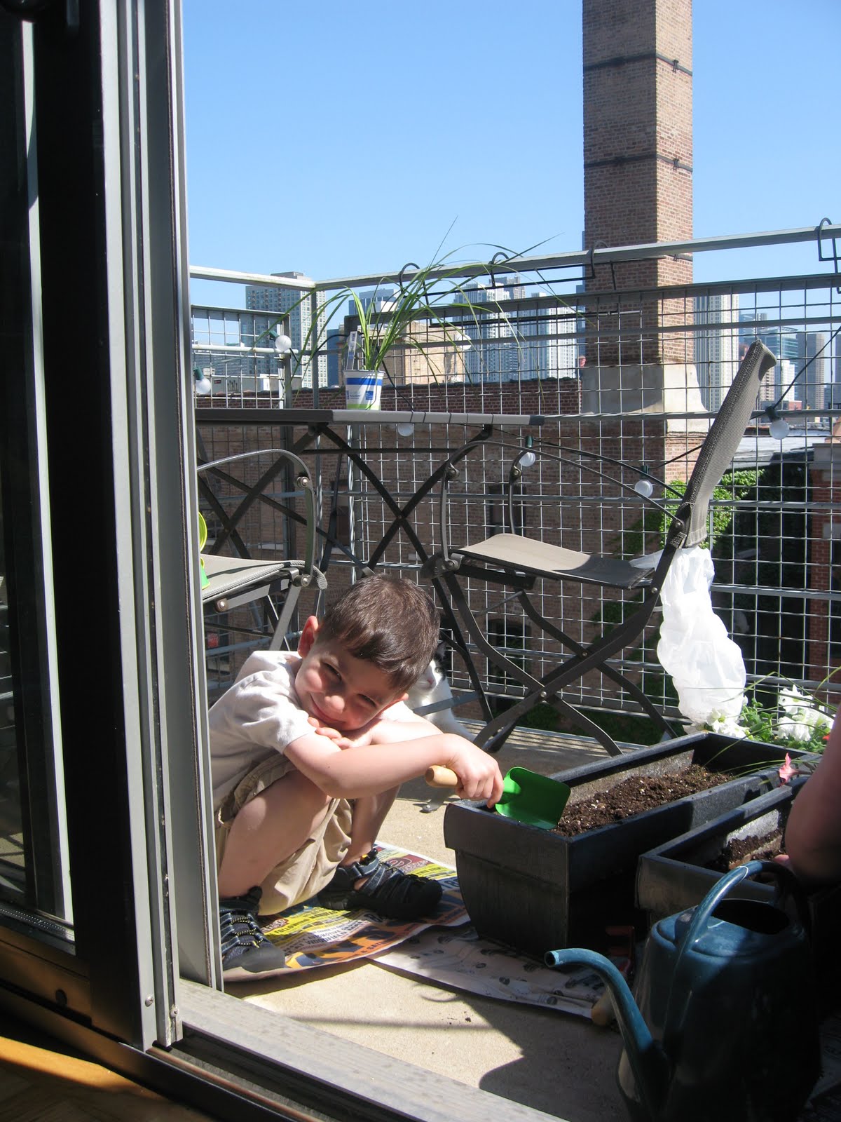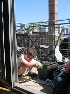 My yard work for the season consisted of me washing down our 4th floor porch table and chairs and planting my flower boxes with Jack today. One neighbor gave us three small cherry tomato plants, so we're going to give those a whirl too.