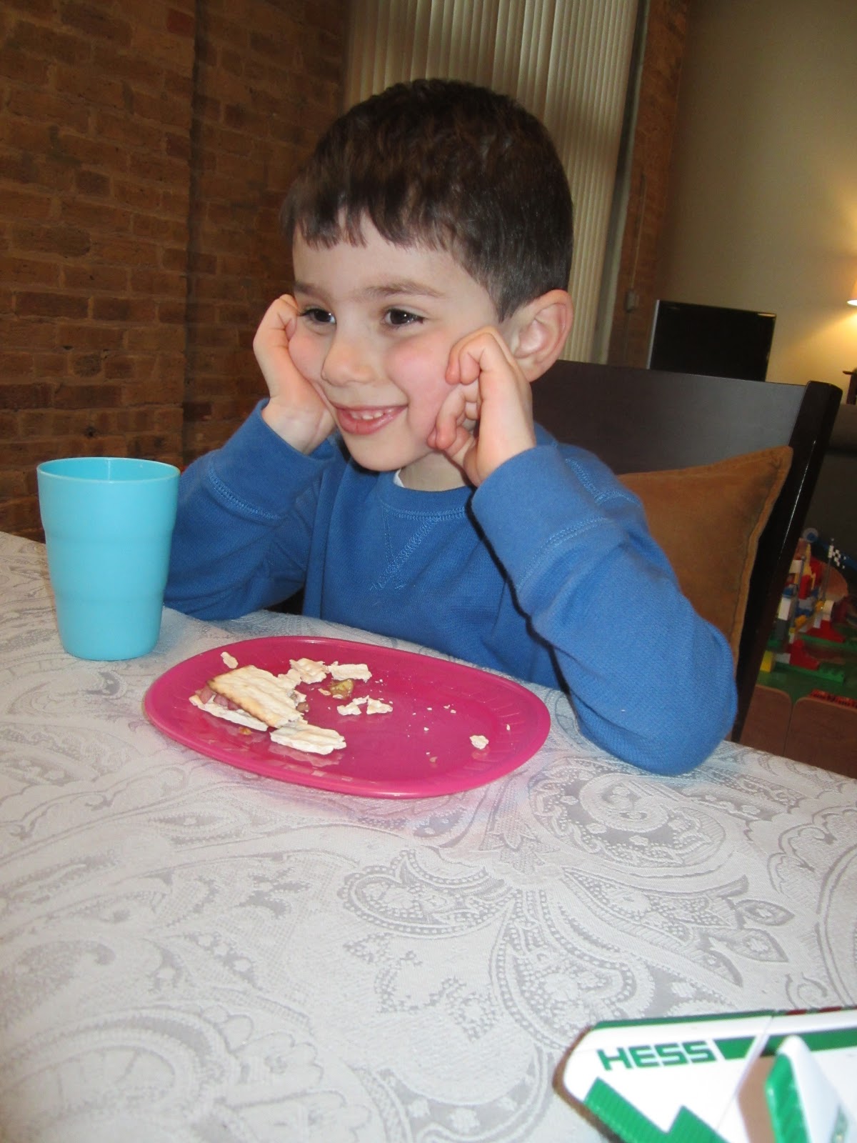 Jack and I went to church. I've never been to a major holiday at my big-city church and there were lines out the door. I went with Jack to the children's service, held in the church cafeteria. We were joined by one of his day school friends. The leader told the Easter story by using differently colored pieces of paper. If a child had a particular color under his/her chair, they were to go stand by the leader. Not all children had a piece of paper, and when the leader called for the color blue, our charismatic Jack announced loudly, "Well, I'm wearing blue." And before I could say anything, he was standing by the leader. Other children caught wind of this notion, and soon half the room was standing at the front. That's my Jack - he can convince you of anything.