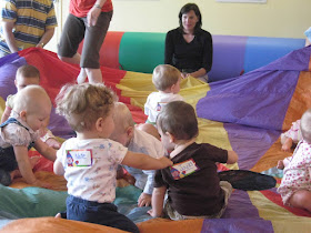I assumed today we'd do the same thing with our babies, but the coach instructed us to run in a circle, turning the parachute as the babies sat on it. I watched Jossie's reaction and was surprised to see she was okay. And then she wasn't okay. She frantically started to sign "All done!" and then burst into tears. I jumped in as soon as I could.
