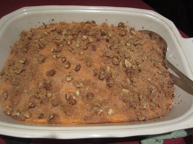 Combine above ingredients thoroughly making sure to cool potatoes slightly before adding eggs. Place in a greased baking dish and sprinkle with topping (I halved the topping). Bake for 30 minutes.