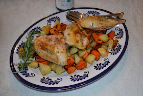 I've spent this weekend pulling the house back together and found a home-hearty meal for Sunday night that is not time-intensive but provides some great aromas from the kitchen. And you roast the chicken atop the vegetables, which makes the vegetables so tender and delicious. It also calls for only 1/3 cup of dry white wine, so there's plenty left over for dinner (a big plus in my kitchen). Serve with a nice green salad and some hearty bread: